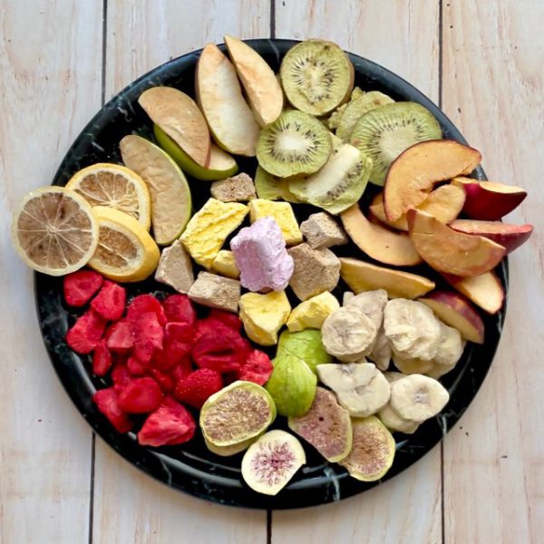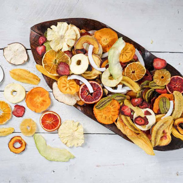 The mixture of 14 organic dried fruits includes plum, banana, strawberry, kiwi, apple, pear, persimmon, coconut, peach, natural pineapple, mango, nectarine, blood orange, Thomson orange, cantaloupe. It is packaged and can be provided to customers in desired quantity.